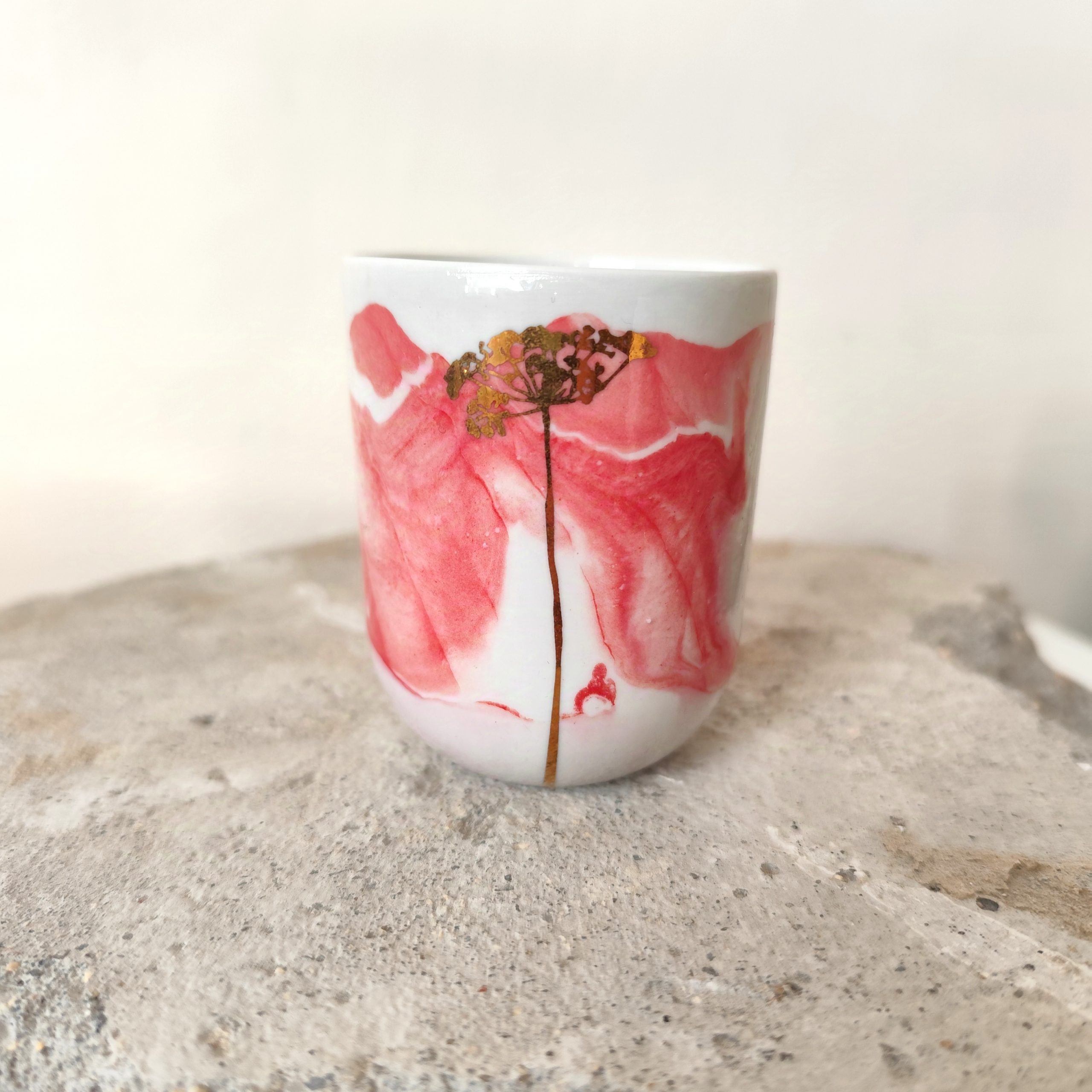 Porcelánový kalíšek se zlatým motivem.