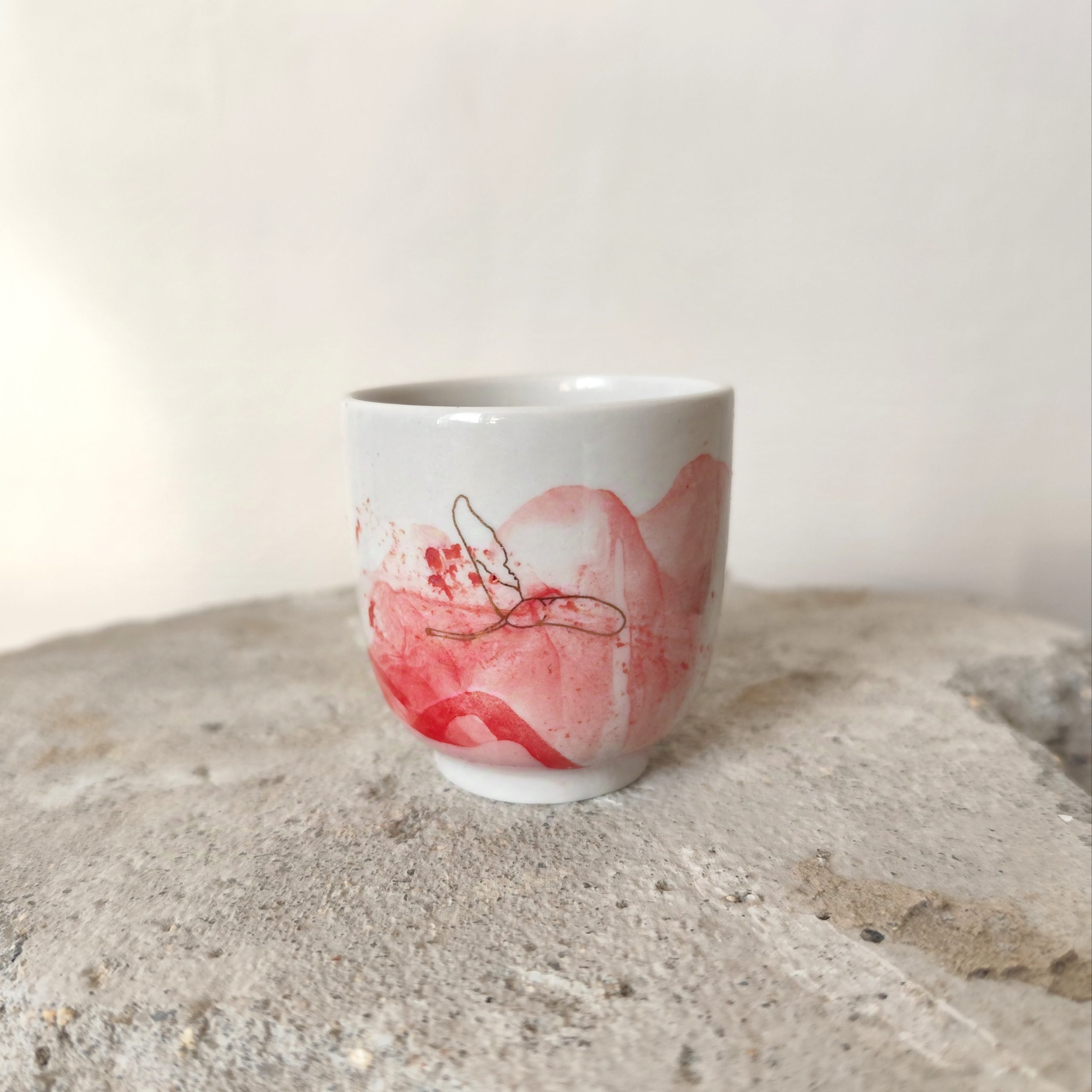 Porcelánový kalíšek se zlatým motivem.